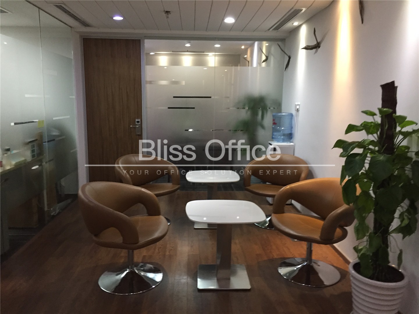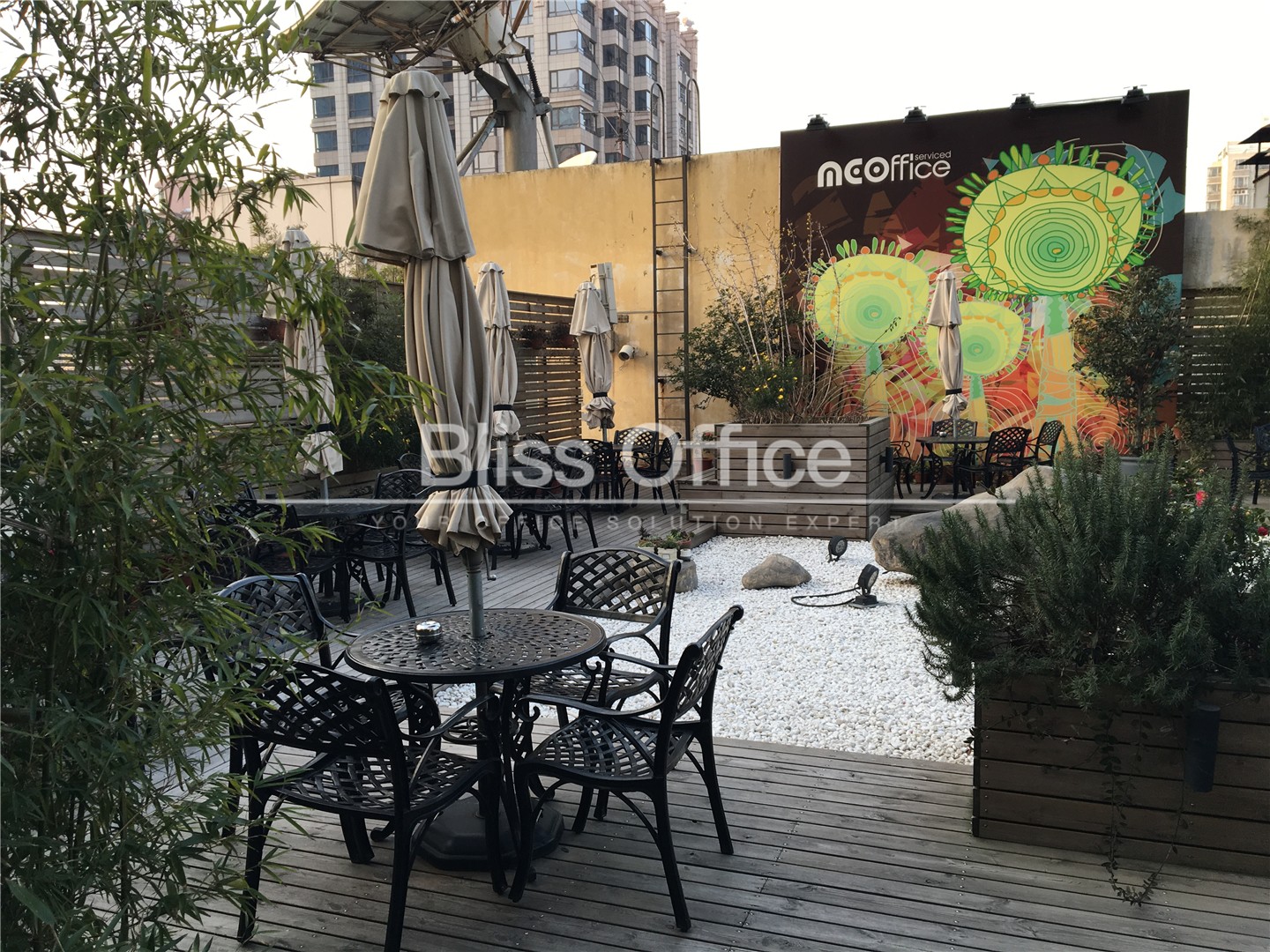 69间可容纳1至12个工作位的独立服务式办公室内置轻奢咖啡区、商务洽谈区、独一无二空中露天花园